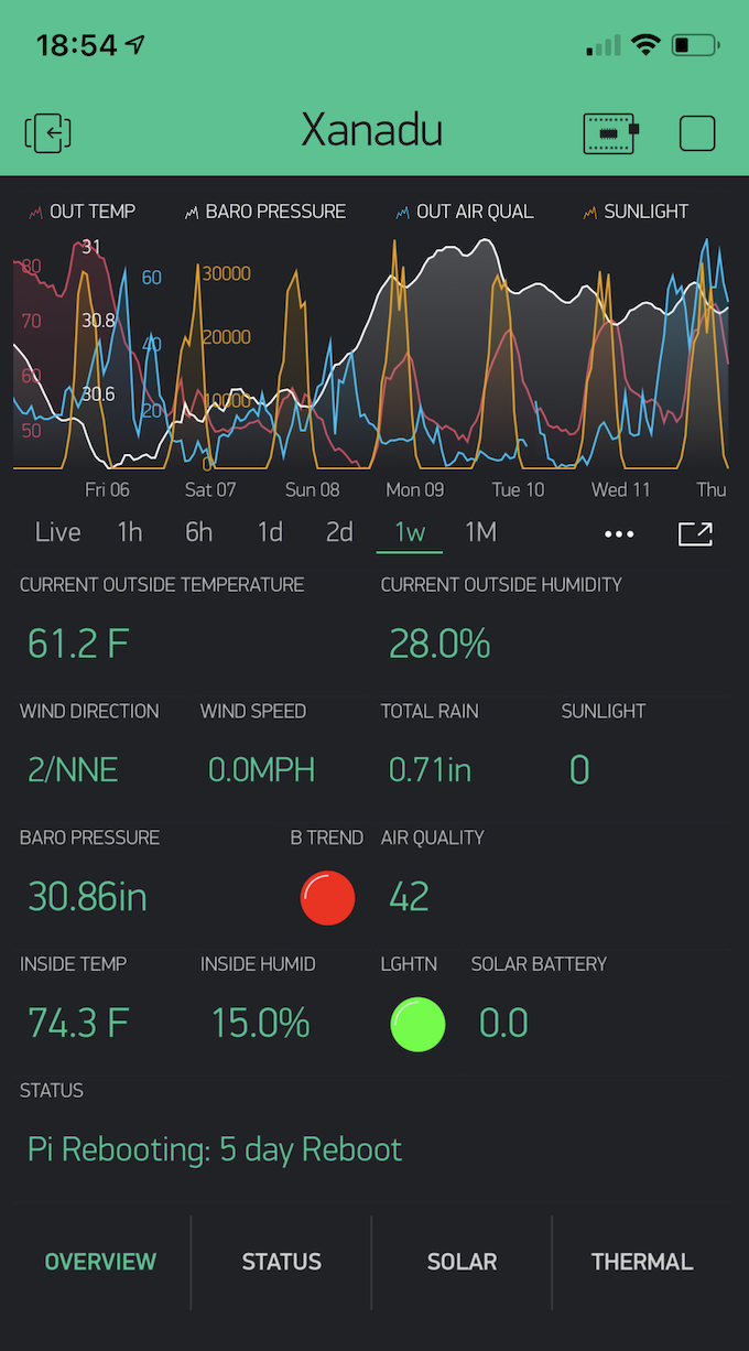 Blynk is a great app that runs on your iPhone, Android and soon a version on a browser. It gives you current status of your station including solar power status, thermal status and current conditions.